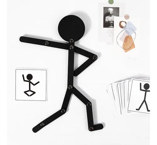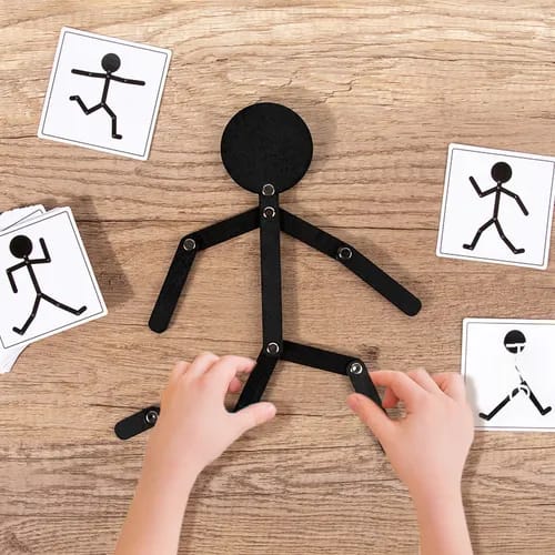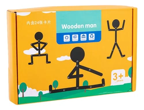 Juego Montessori de madera que desarrolla habilidades motoras finas en los niños. Incluye figura articulada y 24 tarjetas con desafíos progresivos para estimular la creatividad y concentración. Perfecto para aprendizaje lúdico en casa o sala de clases. Tamaño compacto: 17,8 x 12 x 3 cm.